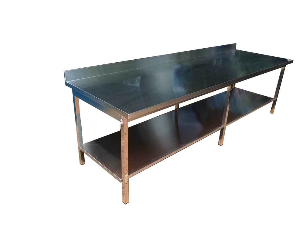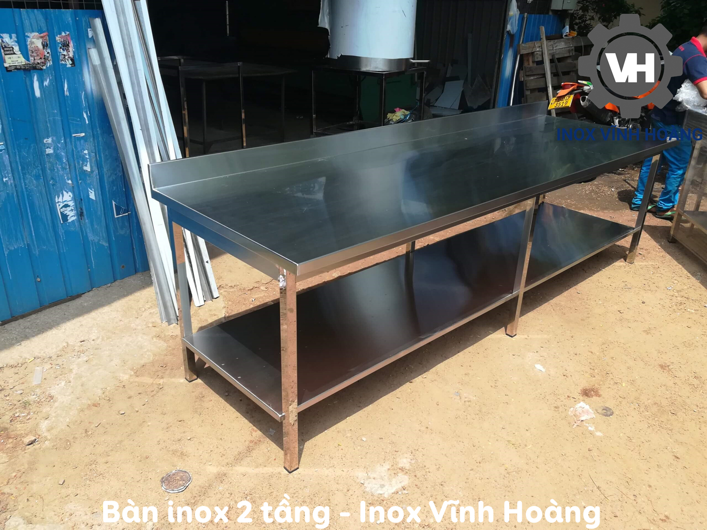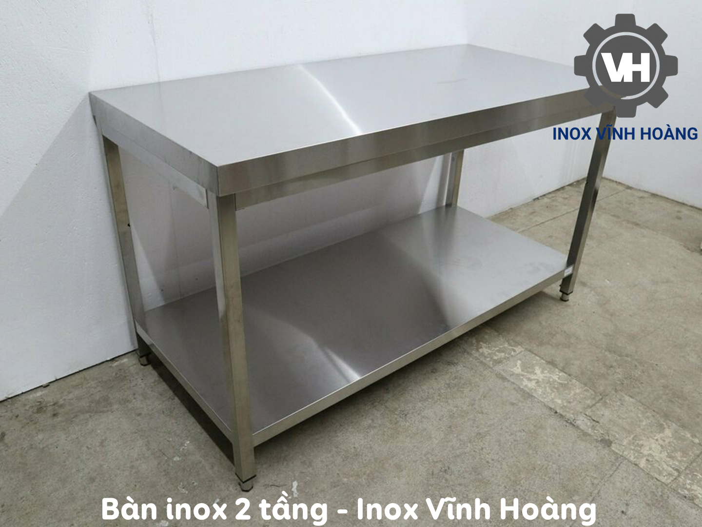 Inox Vĩnh Hoàng gia công bàn inox 2 tầng theo đơn đặt hàng. Kích thước và mẫu mã, kiểu dáng do khách hàng lựa chọn. Công ty sẽ đưa ra bản vẽ 3D theo mô tả của khách hàng, sau khi 2 bên thống nhất về kích thước và giá sẽ đi và chế tạo.